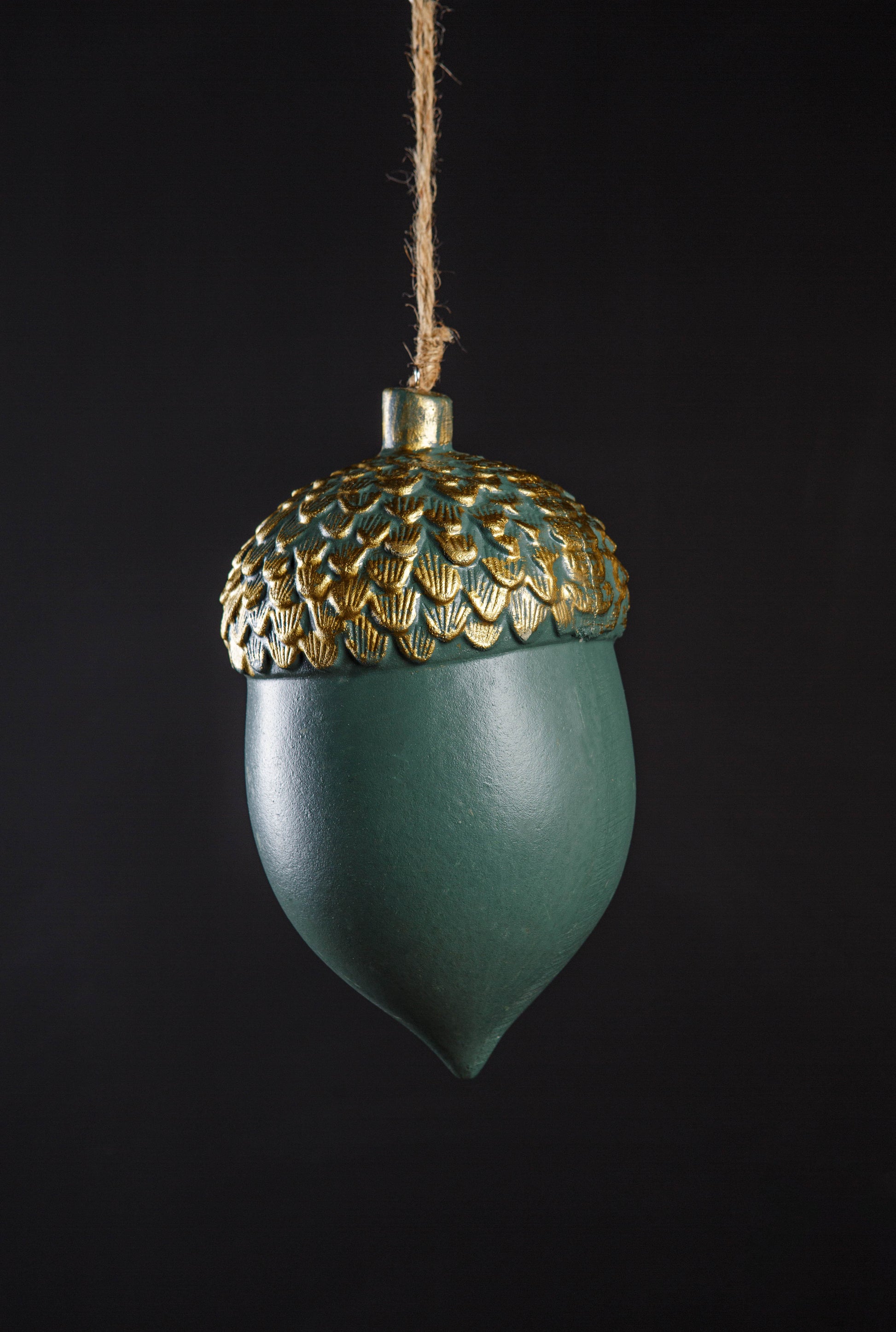 Decora cualquier rincón gracias a nuestra bellota decorativa colgante. Con un diseño en verde botella y dorado, ideal para la temporada de otoño, Navidad o para darle un guiño natural a tu decoración durante todo el año.