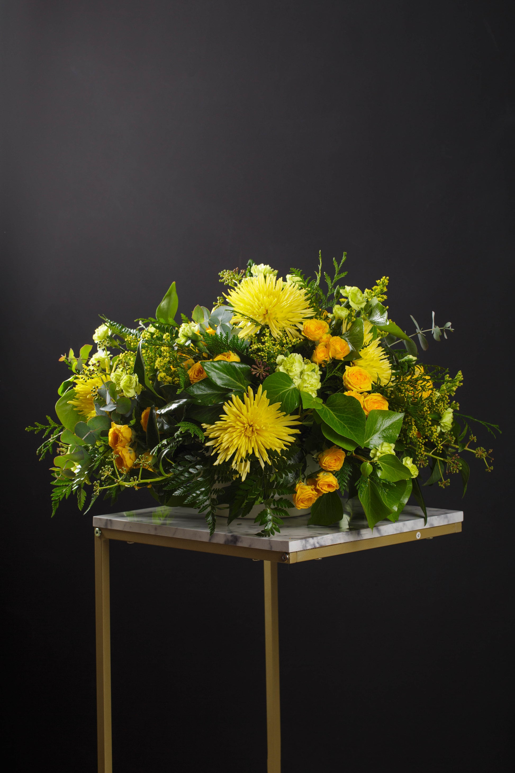 Este centro floral redondo, está compuesto por una cuidada selección de crisantemo, rosa ramificada, solidago y clavel mini.