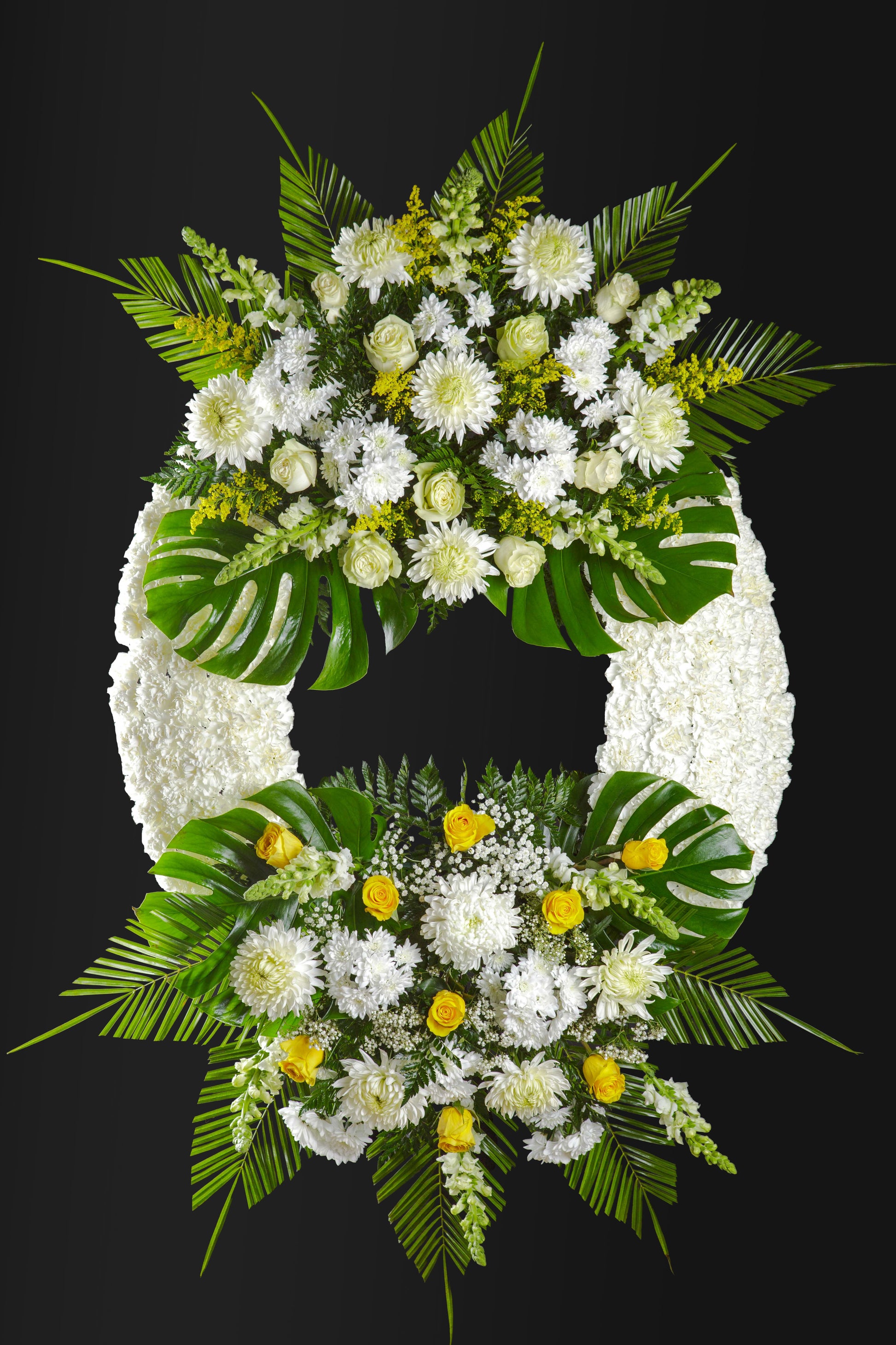 Nuestra corona premium de dos cabeceros está diseñada para ofrecer un último adiós lleno de respeto y amor. Elaborada artesanalmente en Azahar Floristas, combina una cuidada selección de flores naturales de alta calidad: claveles, crisantemos uniflora, rosas, dragonarias, margaritas, solidago, paniculata, monstera, robellini y helecho de cuero.