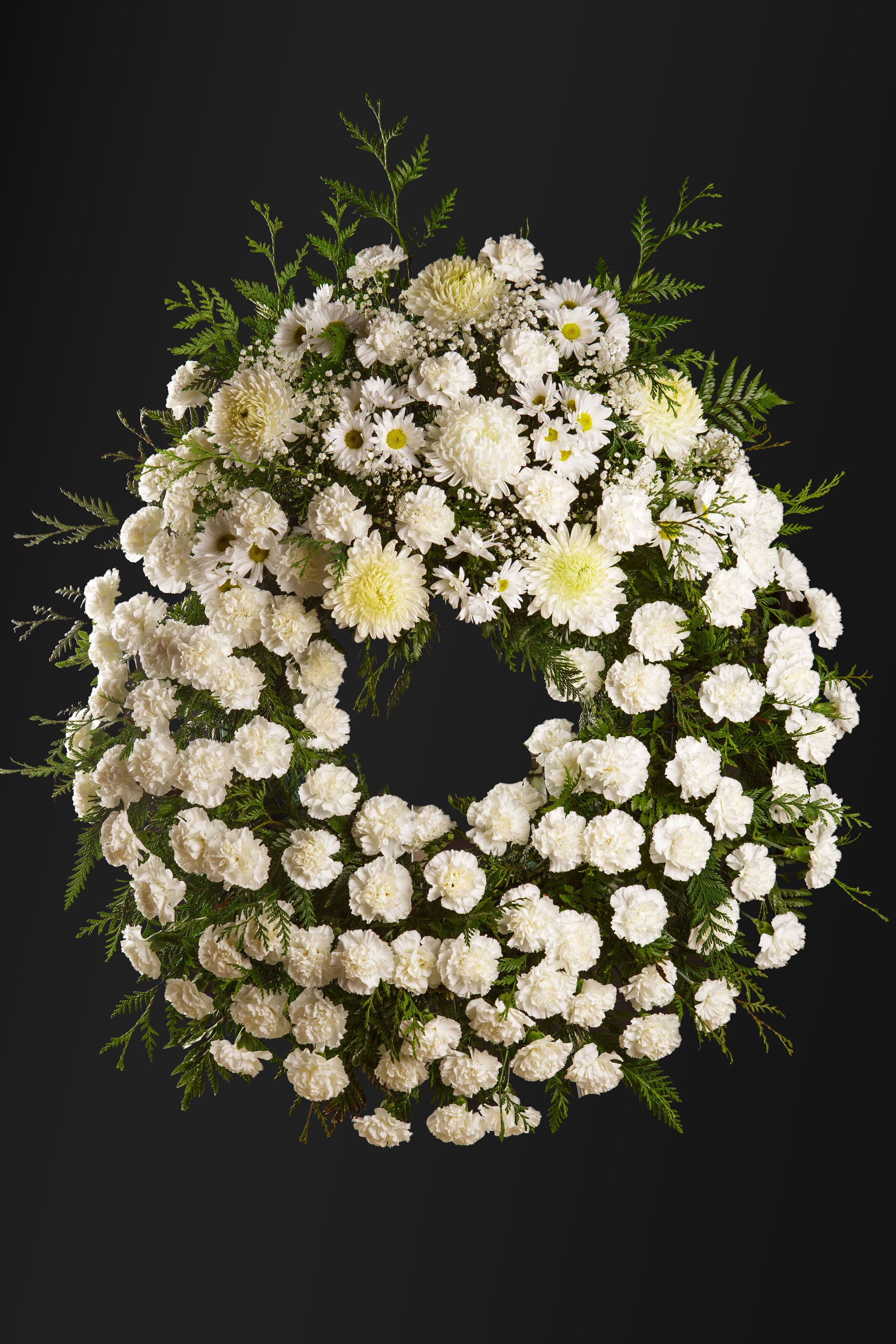 Nuestra corona estándar con cabecero está pensada para ofrecer una despedida respetuosa y cuidada. Elaborada artesanalmente en Azahar Floristas, combina una cuidada selección de flores naturales: claveles, crisantemo uniflora, margaritas y helecho de cuero.