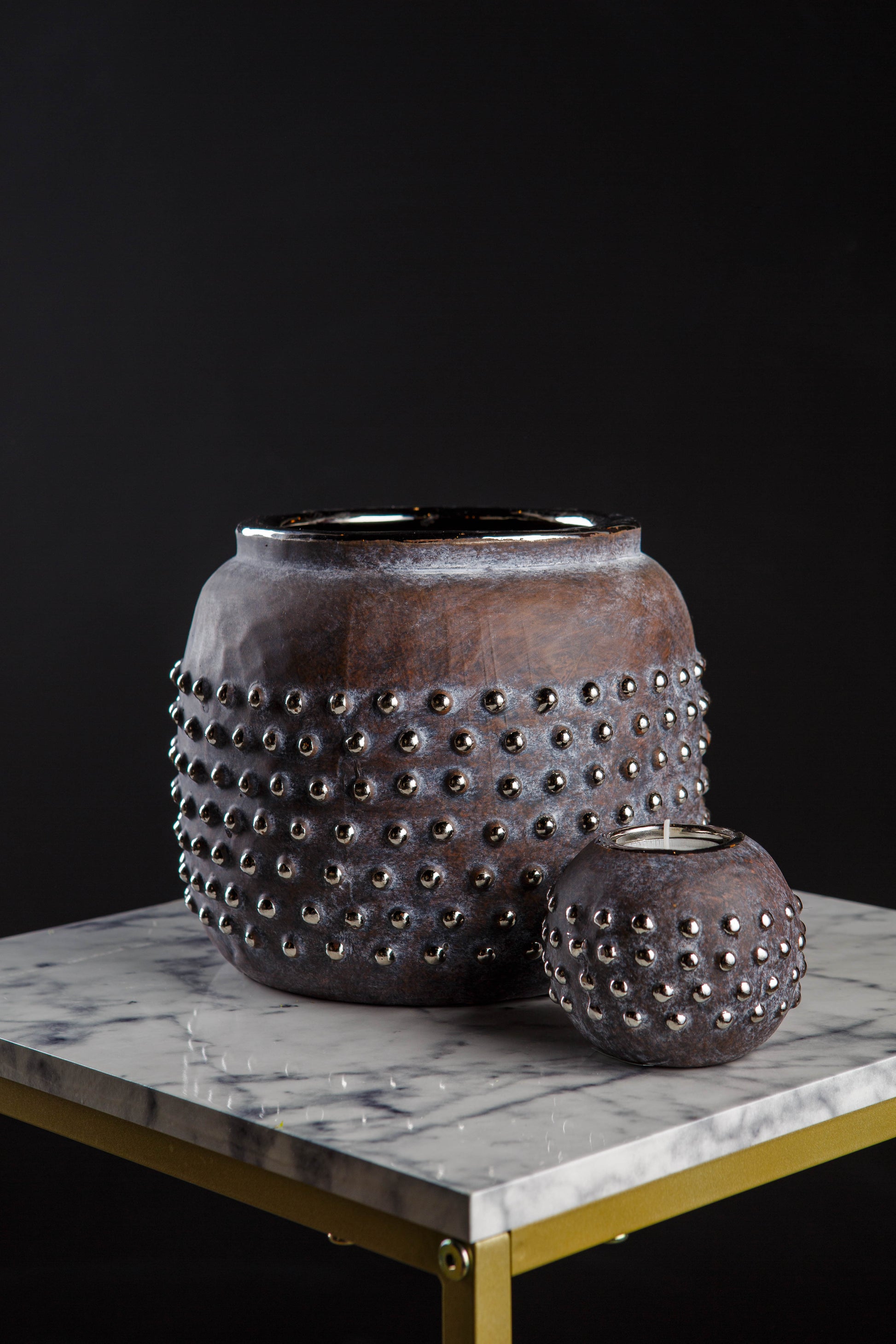 Jarrón decorativo de cerámica en acabado óxido, adornado con detalles de bolitas pintadas en tono plata que aportan textura y carácter al diseño. Su forma ancha y baja lo convierte en una pieza única, ideal para dar un toque contemporáneo y original a cualquier espacio.