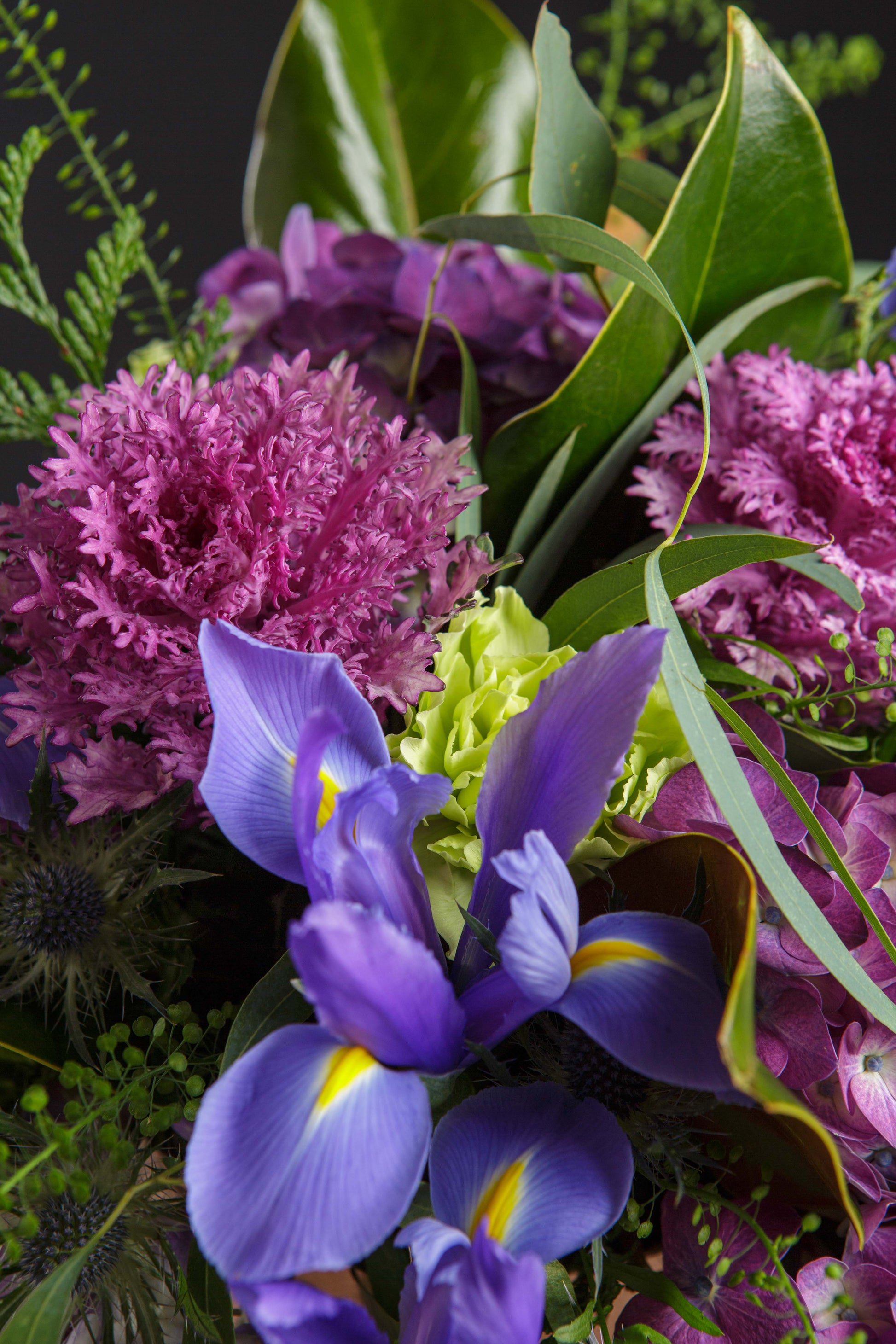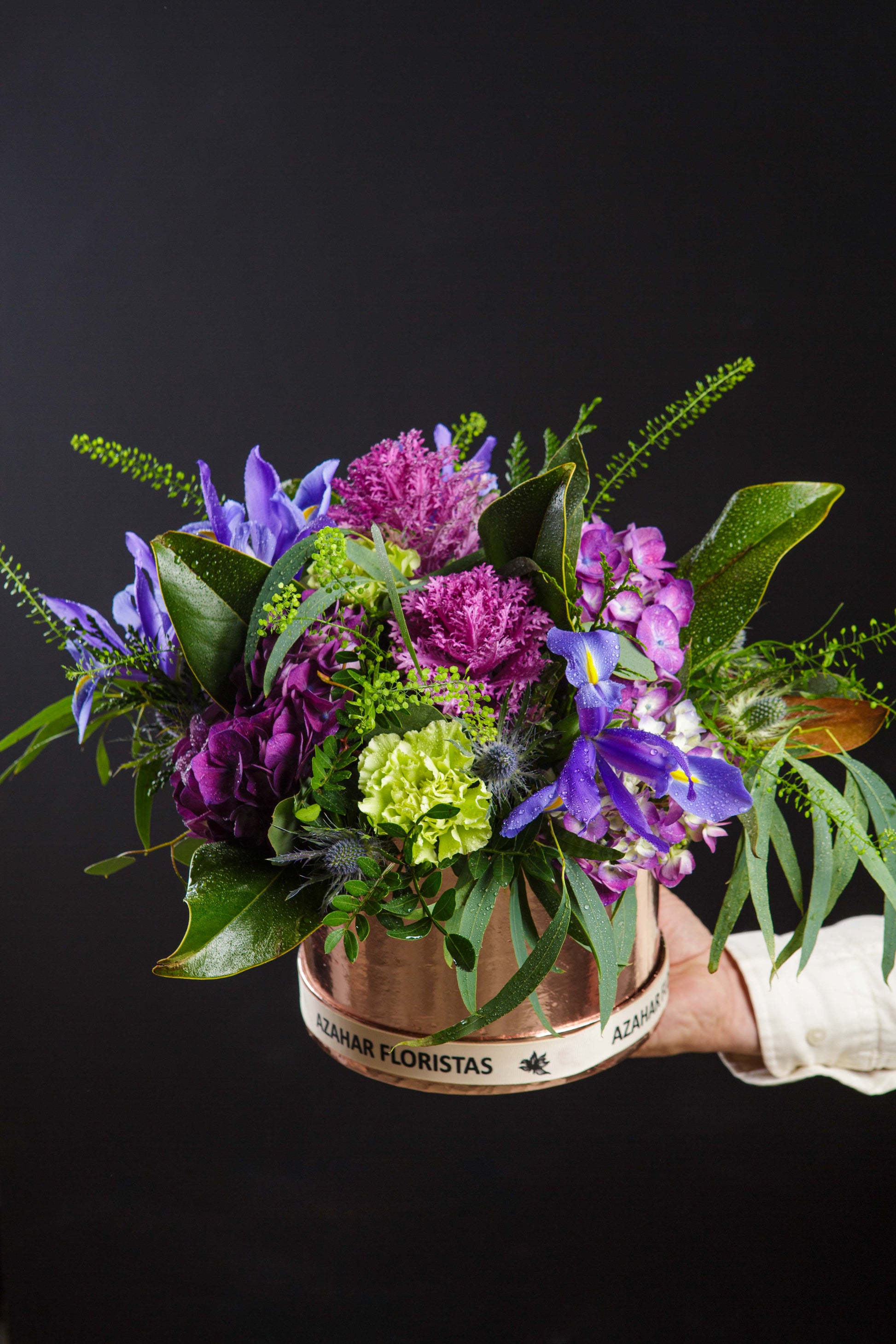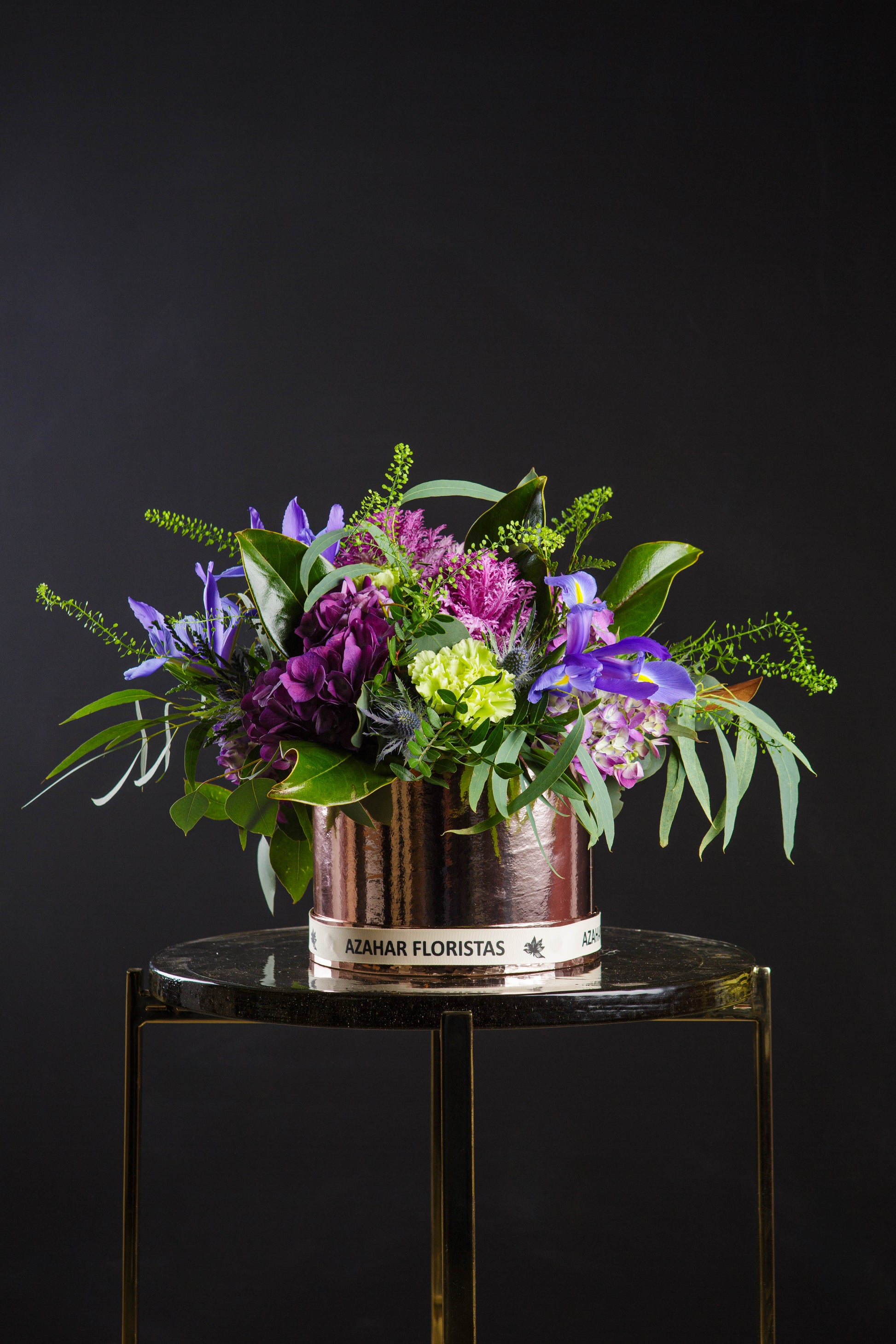 Esta caja en tono cobre aporta un toque distinguido a un arreglo floral lleno de armonía. Los iris azules destacan por su intensidad, mientras que las hojas de magnolio añaden estructura. La combinación de brasicas, hortensia y claveles premium crea un contraste elegante, enmarcado por verdes suaves que equilibran el diseño. Un arreglo sofisticado y encantador, perfecto para decorar o sorprender con un regalo especial.
